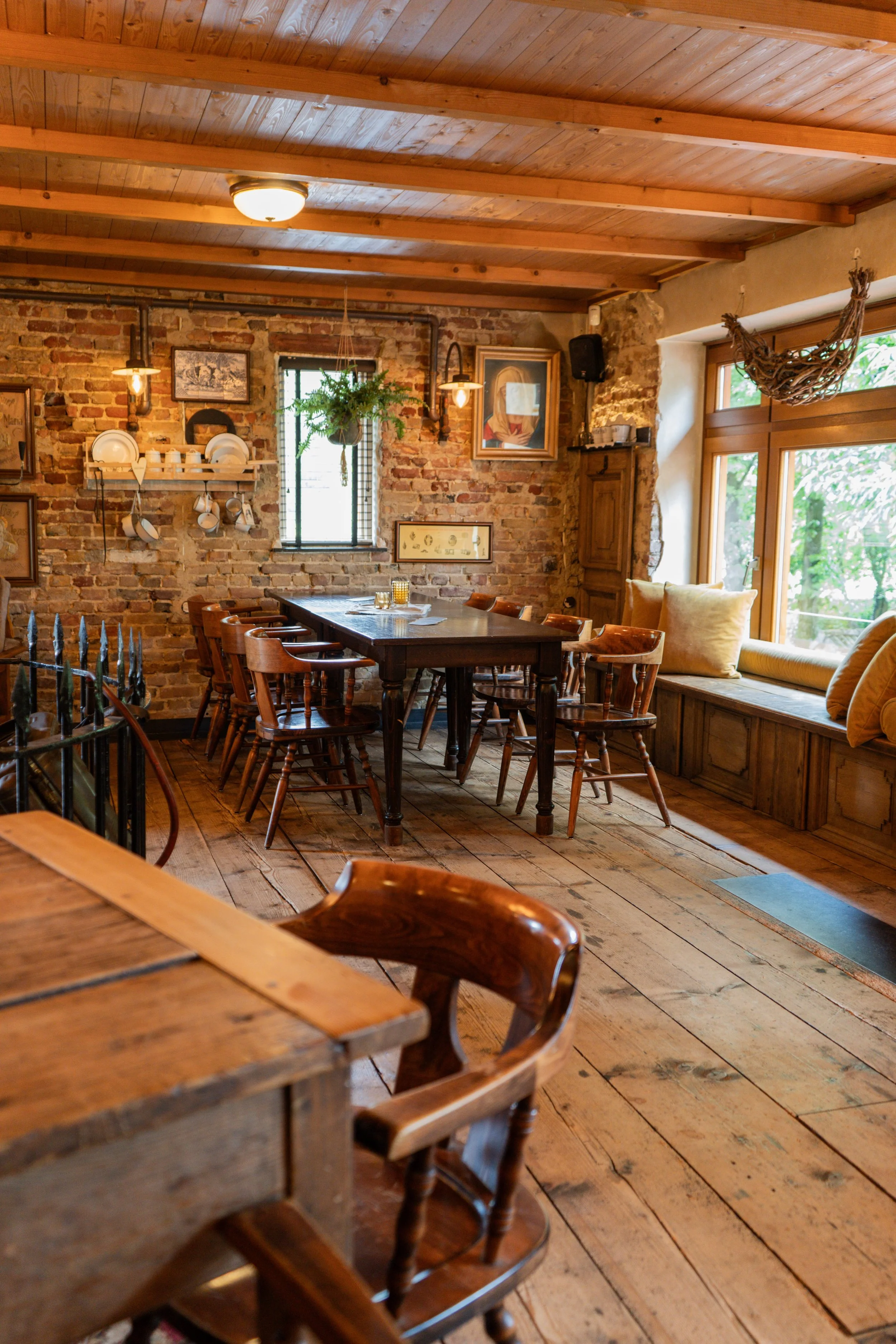 Cozy rustic restaurant interior with wooden furniture, vintage decor, exposed brick walls, and warm lighting.